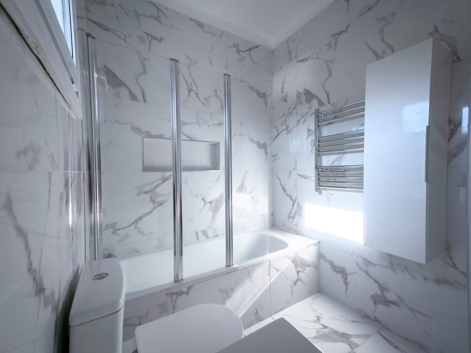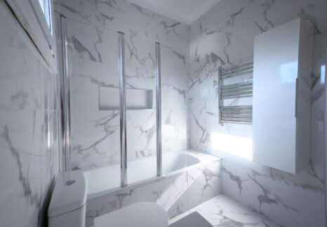 – Casa de banho com cerca de 5 m², revestida em porcelanato nas paredes e no pavimento, equipada com banheira.