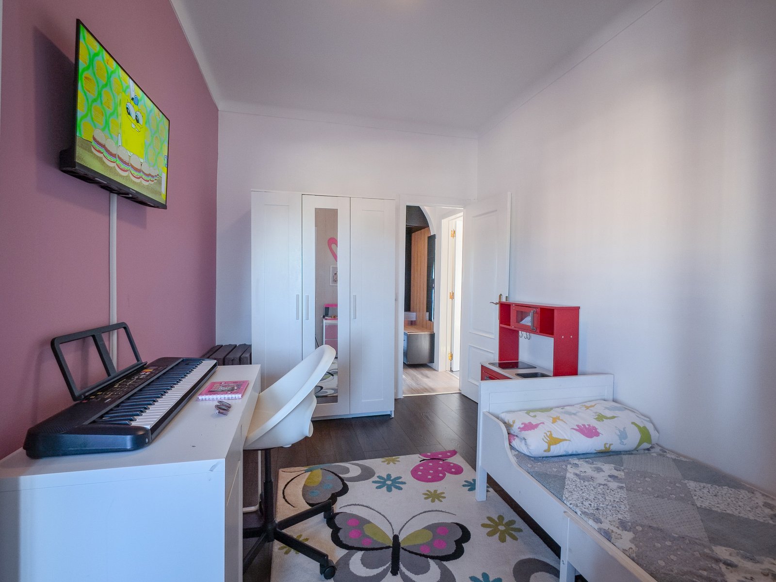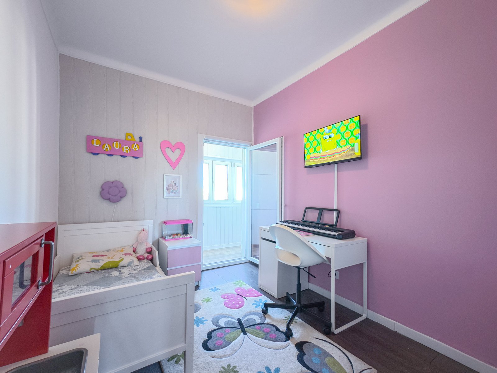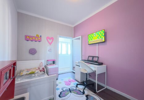 – Segundo quarto de aproximadamente 12 m², com pavimento flutuante e porta em vidro duplo que permite acesso a uma marquise.